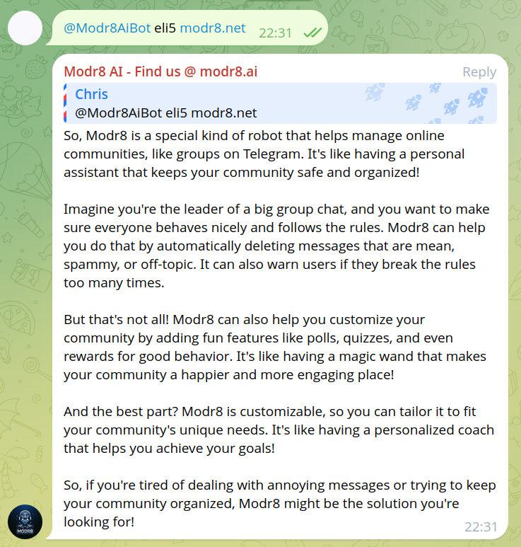 Often communities are full of questions that require moderators and admins to answer after some time. Wouldn't it be better if there was an AI bot that allowed them to ask questions against your pre-defined knowledge articles so that they can instantly get answers?!... Well thankfully your Modr8.ai powered bot can do just that!\