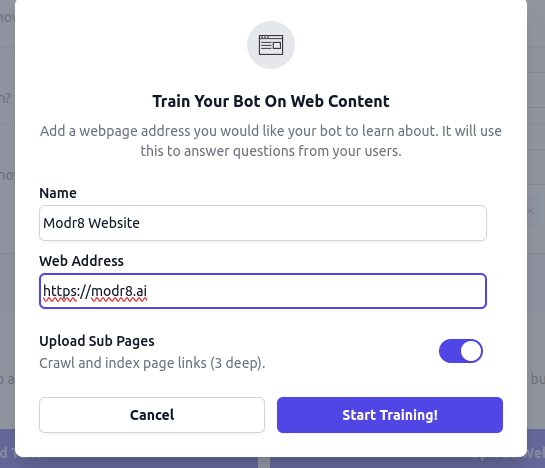 The following section will explain how to train your bot on web content, whilst the process is the same for each type of content if you want to find out more in-depth information check out our [Knowledge Management documentation](https://docs.modr8.ai/features/knowledge-management).